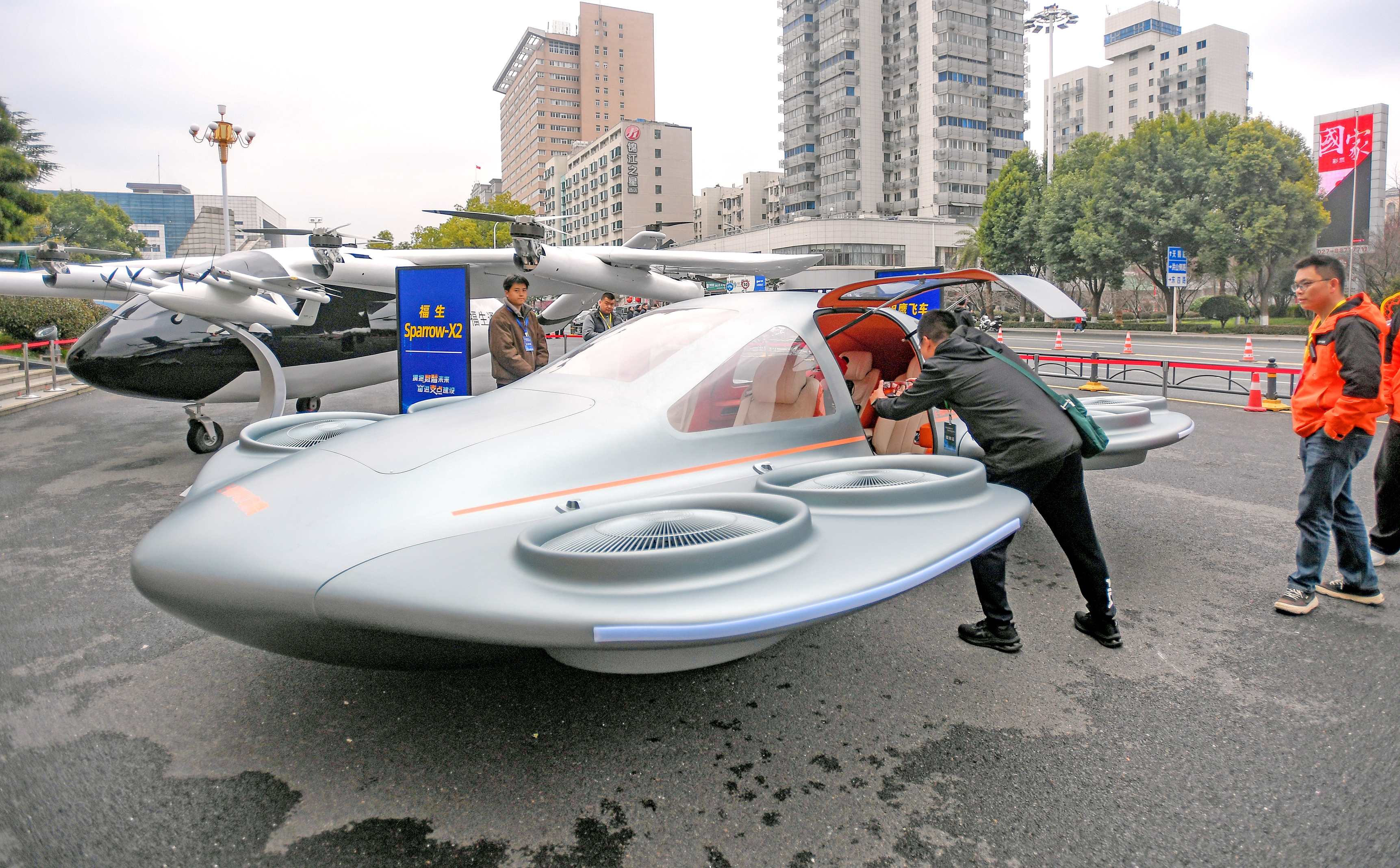 在武汉洪山礼堂对面的小广场上,电鹰科技展示的“电鹰飞车”吸引了不少市民关注。这架银灰色的飞行器整机长5.6米,宽3.9米,高1.6米,和一辆家用轿车的尺寸相仿,最大载重达450公斤。