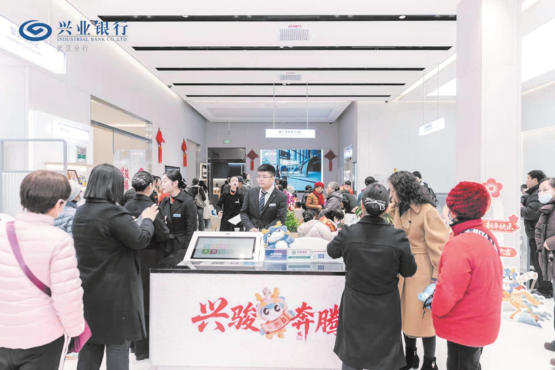 据悉,马年春节期间,兴业银行武汉分行辖内71家网点同步完成焕新装扮。以自有IP“兴福龙”为核心元素,搭配马年新春元素、喜庆灯笼等传统符号,通过窗花、桌摆、挂饰等形式点亮厅堂,让客户在办理业务的同时,直观感受扑面而来的新春暖意。