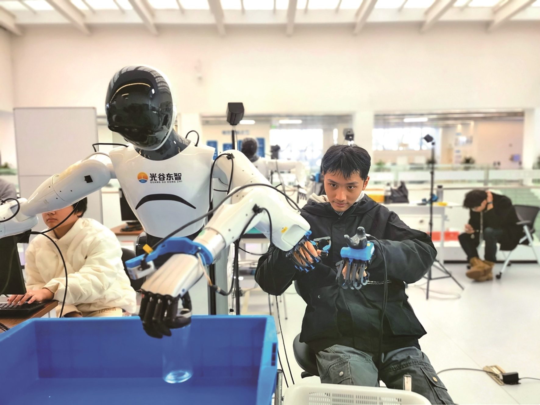 这里还有数据采集区。只见一名训练师手上戴着布满传感器的特殊机械手套,指尖微微弯曲,手腕轻抬发力,手套上的传感器瞬间捕捉到这一系列精细动作,同步传输给前面的人形机器人。机器人的机械手臂随即缓缓移动,关节灵活转动,指尖稳稳扣住蓝色塑料筐中的瓶子,将其拿起,放入旁边的白色塑料筐中。当机器人最终按规范要求完成这套动作时,一旁的电脑系统立刻响起清脆的“真好”夸奖声,那代表成功录入一条有效的模型数据,仿佛是老师对学生优秀表现的点赞。