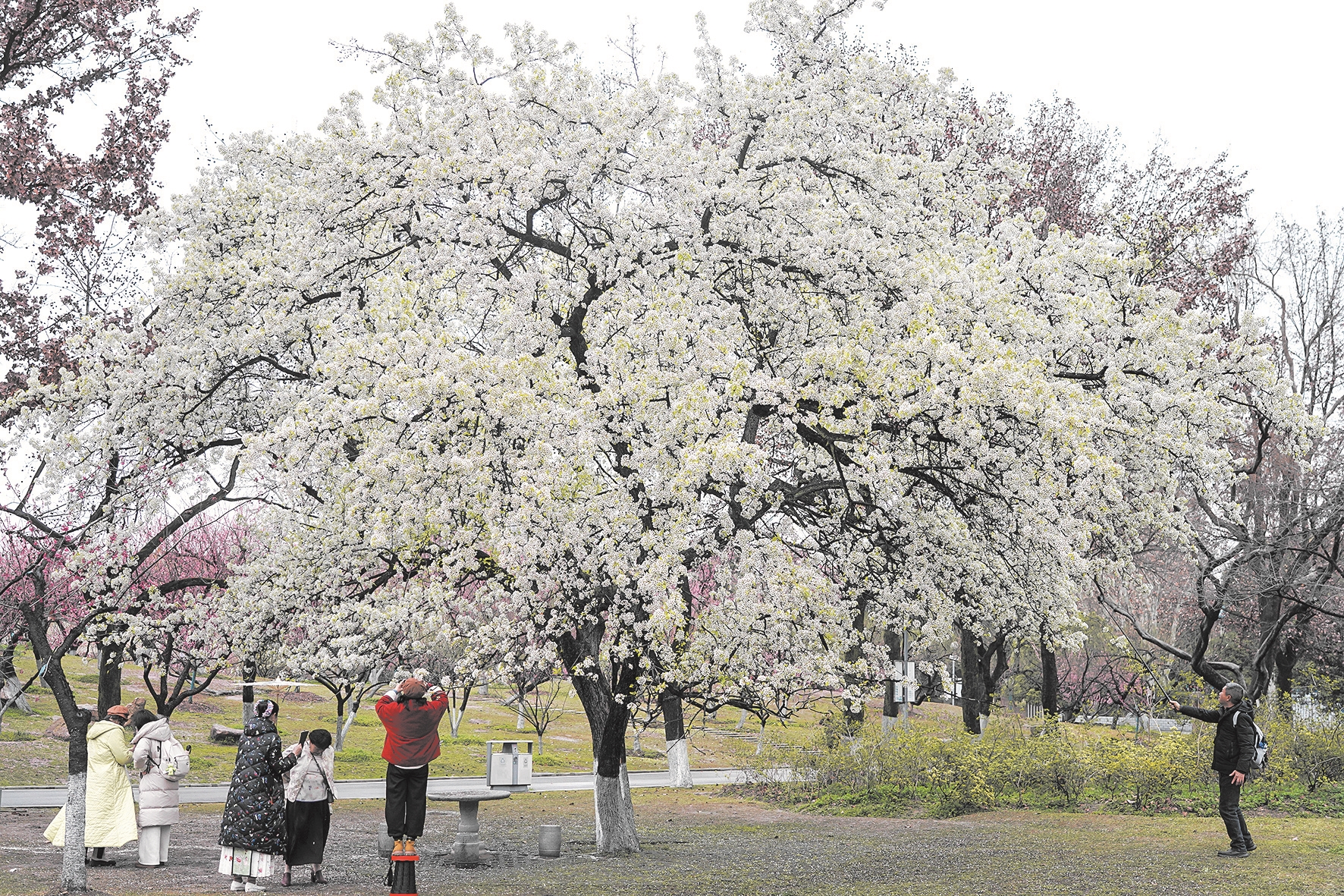 2月26日,江城春雨淅沥,武汉青山公园一棵树龄达58年、身高逾10米的老梨树,正值一年一度的盛花期。满树梨花晶莹如雪,层层叠叠,如云团般铺天盖地。尽管天空飘着小雨,但丝毫不减其绚烂。洁白的花朵缀满枝头,在雨丝浸润下更显清丽脱俗。游客们或驻足仰观,赞叹其壮观;或冒雨在树下拍照,记录下这“梨花带雨”的春日限定美景。这棵老树用它如云似雪的花海,在新春为人们带来了一场浪漫而充满生命力的视觉盛宴。