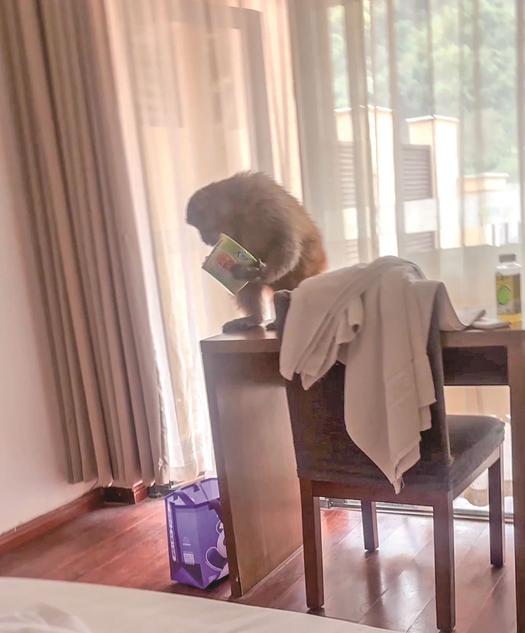2月26日,视频拍摄者可可(网名)告诉极目新闻记者,她在重庆统景温泉酒店入住3楼的一个房间,外面有一个小露台。25日上午10时许,她睡过头错过了酒店的早餐,本想用24日晚剩下的一桶方便面垫肚子,结果正好看到一只猴子拿走了泡面。