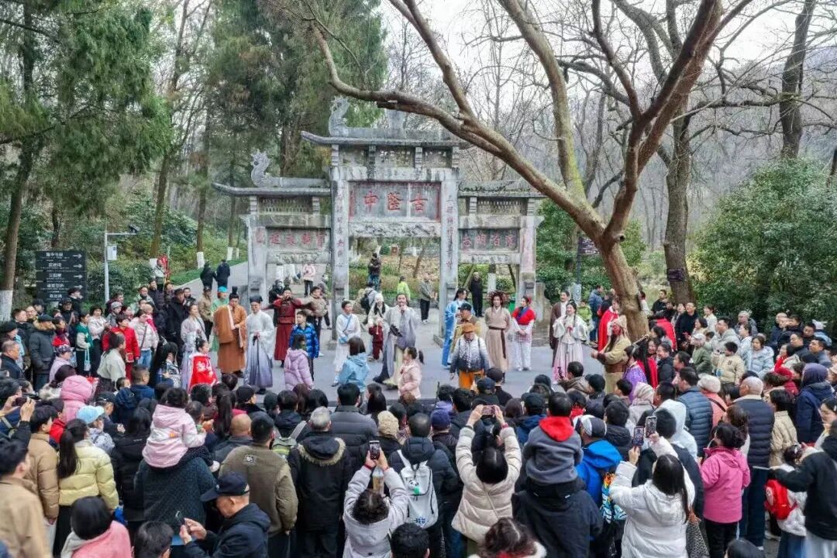 当日上午,古隆中景区已被浓厚的三国氛围包裹,牌坊下鼓乐齐鸣,迎宾开场秀率先点燃全场热情,身着古装的工作人员穿梭在红灯笼点缀的街巷间,氛围感直接拉满。“诸葛亮”摇着羽扇缓步走来,“关羽”“张飞”列队随行,一场别开生面的三国人物巡游正式开启,途经三顾堂等景点,引得游客纷纷驻足合影、讨取新春福运,小朋友们更是兴奋地追着NPC奔跑,欢声笑语响彻景区。