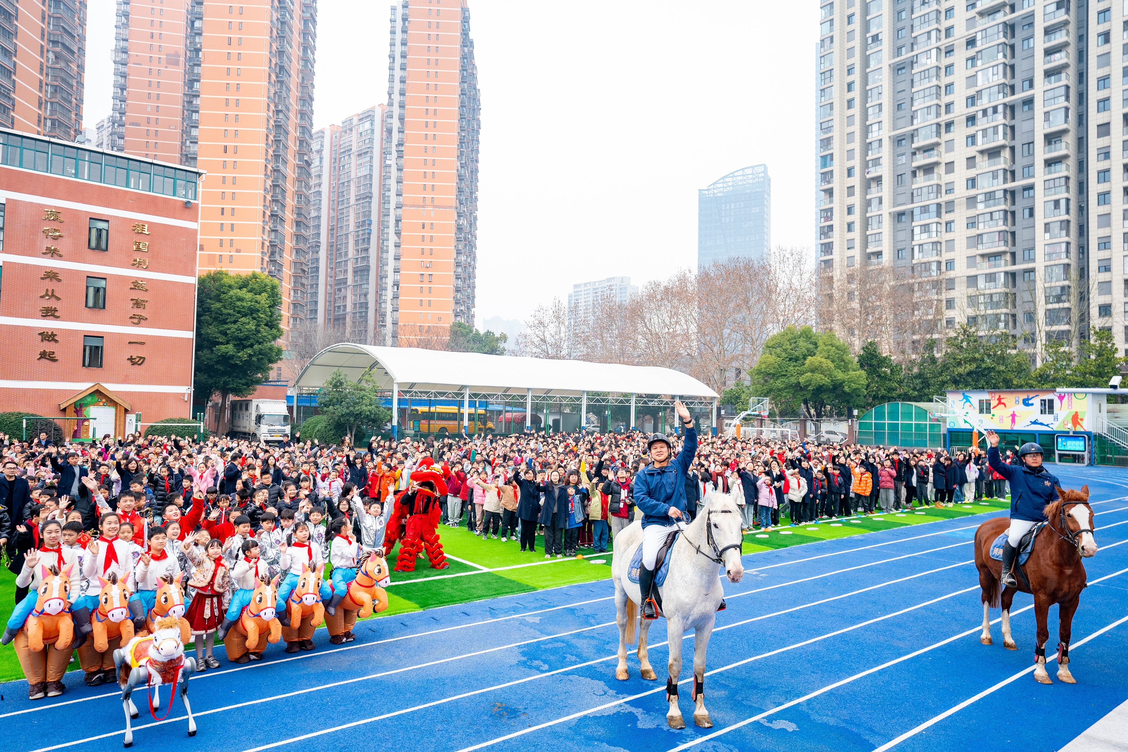 3月4日,武汉市洪山区未来实验外国语学校美林校区热闹非凡,学校特地请来参加过省运会比赛的三匹骏马来到学生中间,马上进步、马上成功具象化了。三名专业的马术教练骑着骏马绕操场一周,手持“一马当先”“马力全开”“马到成功”的旗帜,把新学期最美好的祝福送给同学们。楚天都市报极目新闻记者魏铼摄