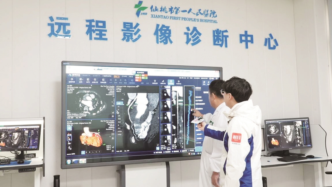 那么,这些从乡镇传出的影像,在“云端”的另一端是如何被接收、诊断并传回的呢?记者随后来到仙桃市第一人民医院远程影像诊断中心。一块智能大屏幕上,正实时显示着来自各乡镇卫生院的会诊申请列表——机构名称、患者基本信息、检查部位影像等关键信息一目了然。该院放射影像科主任吕旭光介绍,该中心于2018年成立,目前已联网覆盖15家乡镇卫生院。中心日常配备约30名医生,他们不仅负责本院DR、CT、磁共振等影像诊断工作,也同步审核基层医院上传的影像资料,提供7×24小时不间断服务,确保群众在家门口做的检查,能及时获得专业诊断。