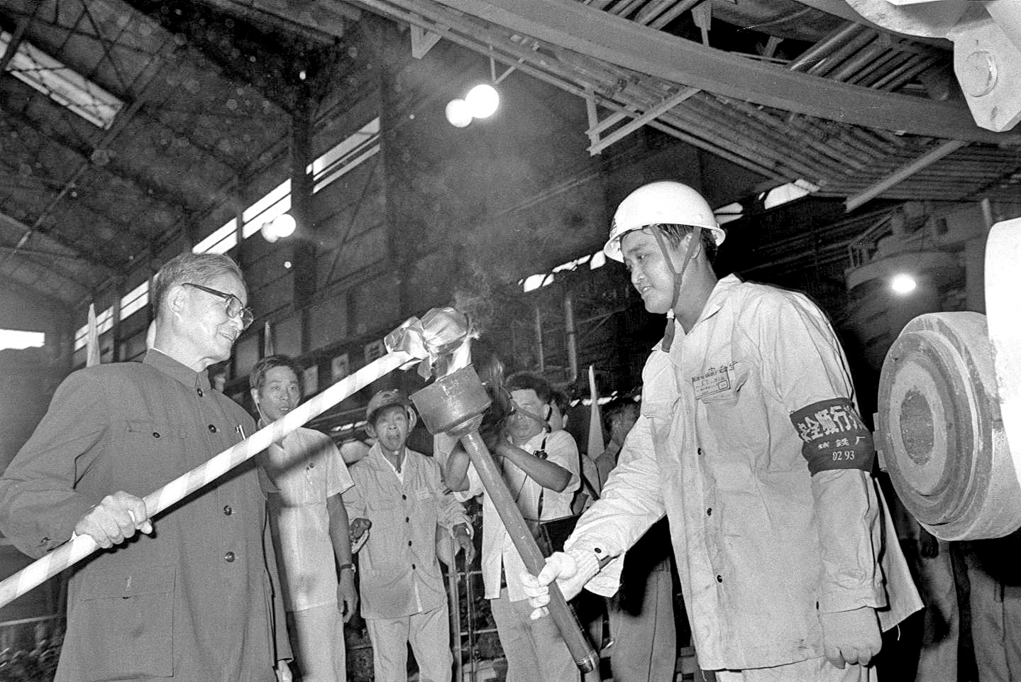 1985年9月15日,我国第一座日产万吨铁的高炉——宝钢一号高炉点火试生产,这是宋平同志(左一)为高炉点火