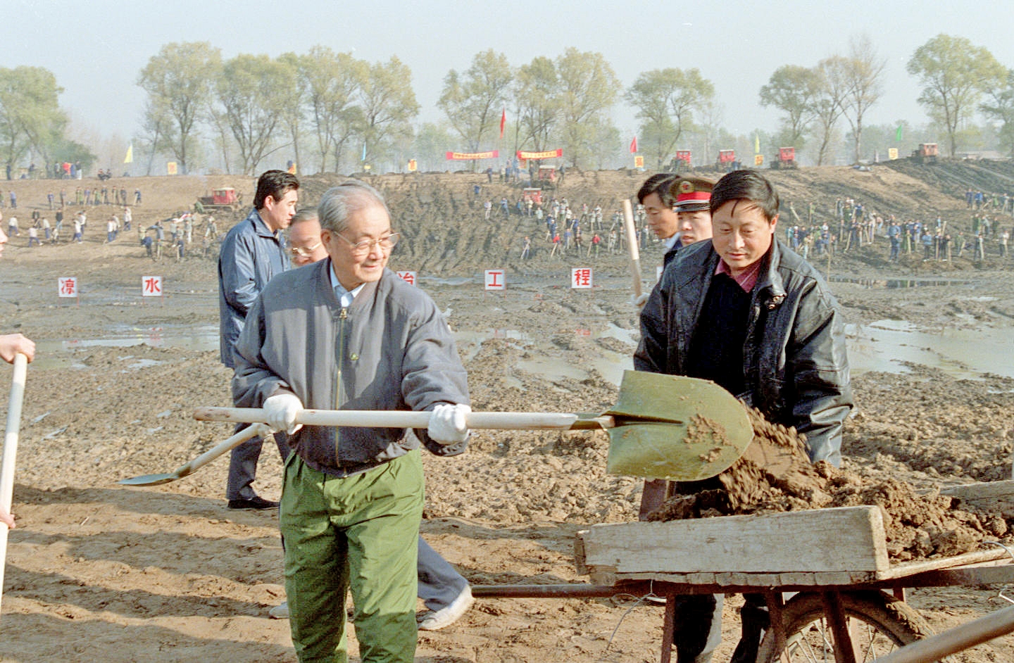 1991年11月13日,宋平同志(左)来到北京市通县(今通州区)张家湾凉水河整治工程工地参加劳动