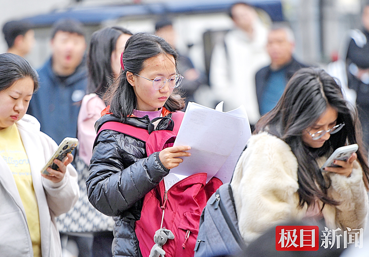 上午8时许,极目新闻记者在湖北大学考点外看到,考生们正排队等候入场,不少考生仍在抓紧时间复习。