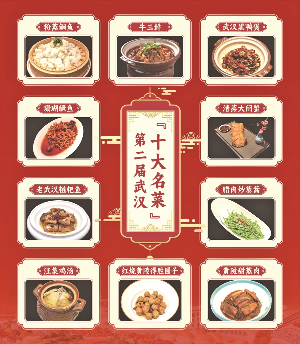 第二届武汉“十大名菜、十大名点、十大伴手礼”发布现场,武汉餐饮业协会会长刘国梁发布第二届武汉“十大名菜”分别为:粉蒸鱼、牛三鲜、武汉黑鸭煲、珊瑚鳜鱼、清蒸大闸蟹、老武汉糍粑鱼、腊肉炒藜蒿、汪集鸡汤、红烧黄陵德胜圆子、黄陂甜蒸肉。“十大名点”为:生煎包、锅贴、红糖糍粑、武汉凉面、武汉油香、鸡冠饺、油饼包烧麦、汉南甜玉米饼、欢喜坨、香煎米粑。