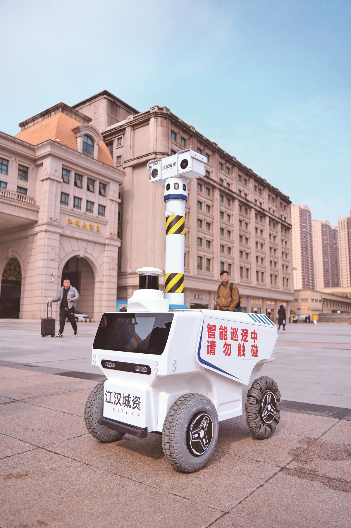 这台会喊话的机器人,是汉口火车站地区综合管理办公室最近引入的AI智能巡检机器人。这台巡检机器人,别看它个头不大,本事可不小。它头顶360度高清摄像头,内置多种AI算法,走在广场上,眼睛一刻不停:谁在禁烟区抽烟、哪个垃圾桶快满了、有没有共享单车出入……但凡发现异常,它都能立刻识别并发出语音报警,或在后台生成工单,由工作人员及时处置。