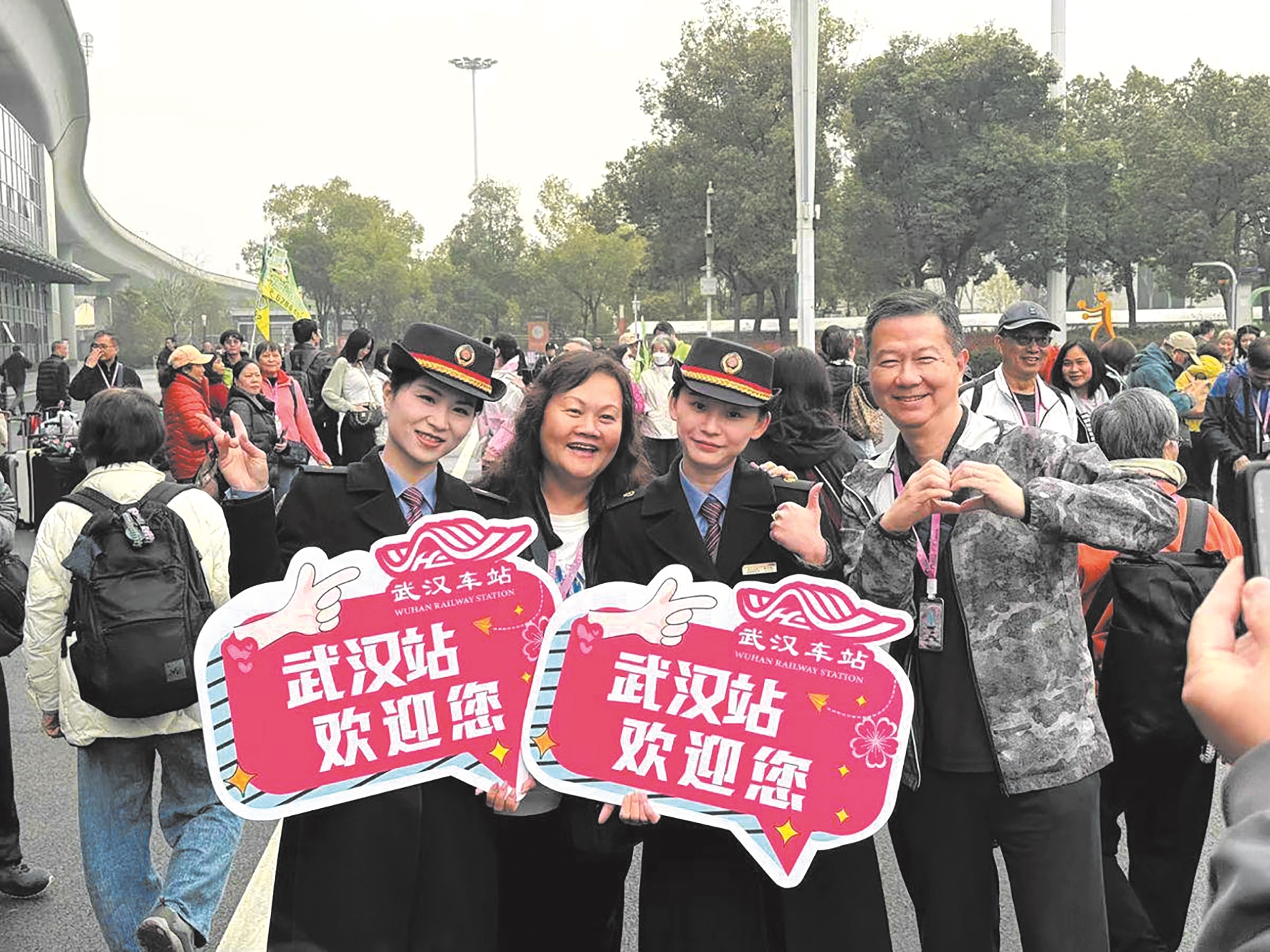 今年赏樱季,武汉站还创新打造“到站即花海”沉浸式体验,将樱花主题展板与20棵真樱花树搬进站区,粉樱缀枝、暗香浮动,不少香港旅客驻足打卡,把这份初到武汉的美好定格成永恒。车站还安排“五心服务组”化身专业“樱花导游”,工作人员提前熟记全市81个赏樱点位、最佳观赏期及交通路线,为游客提供精准、及时的赏花咨询。