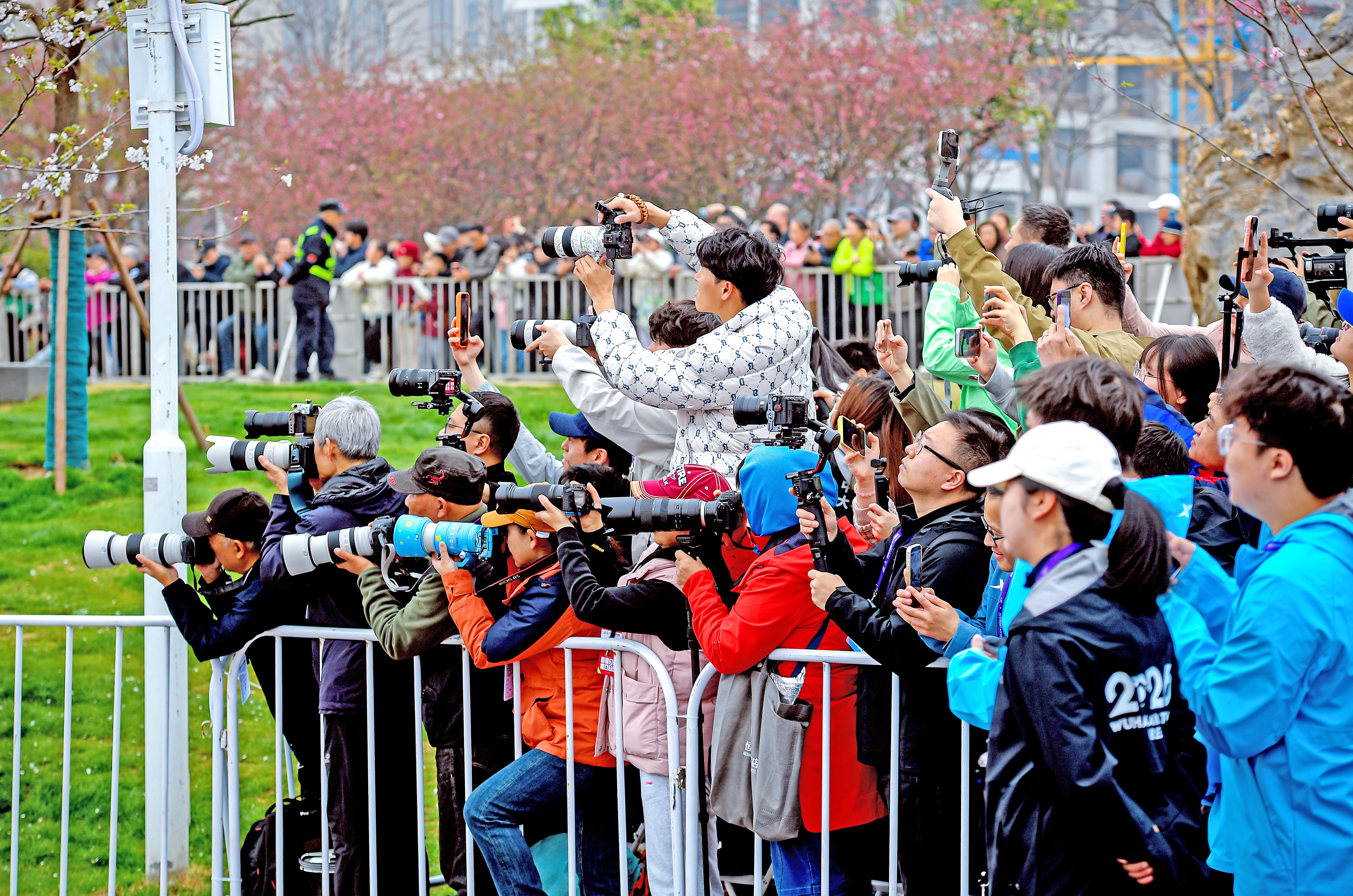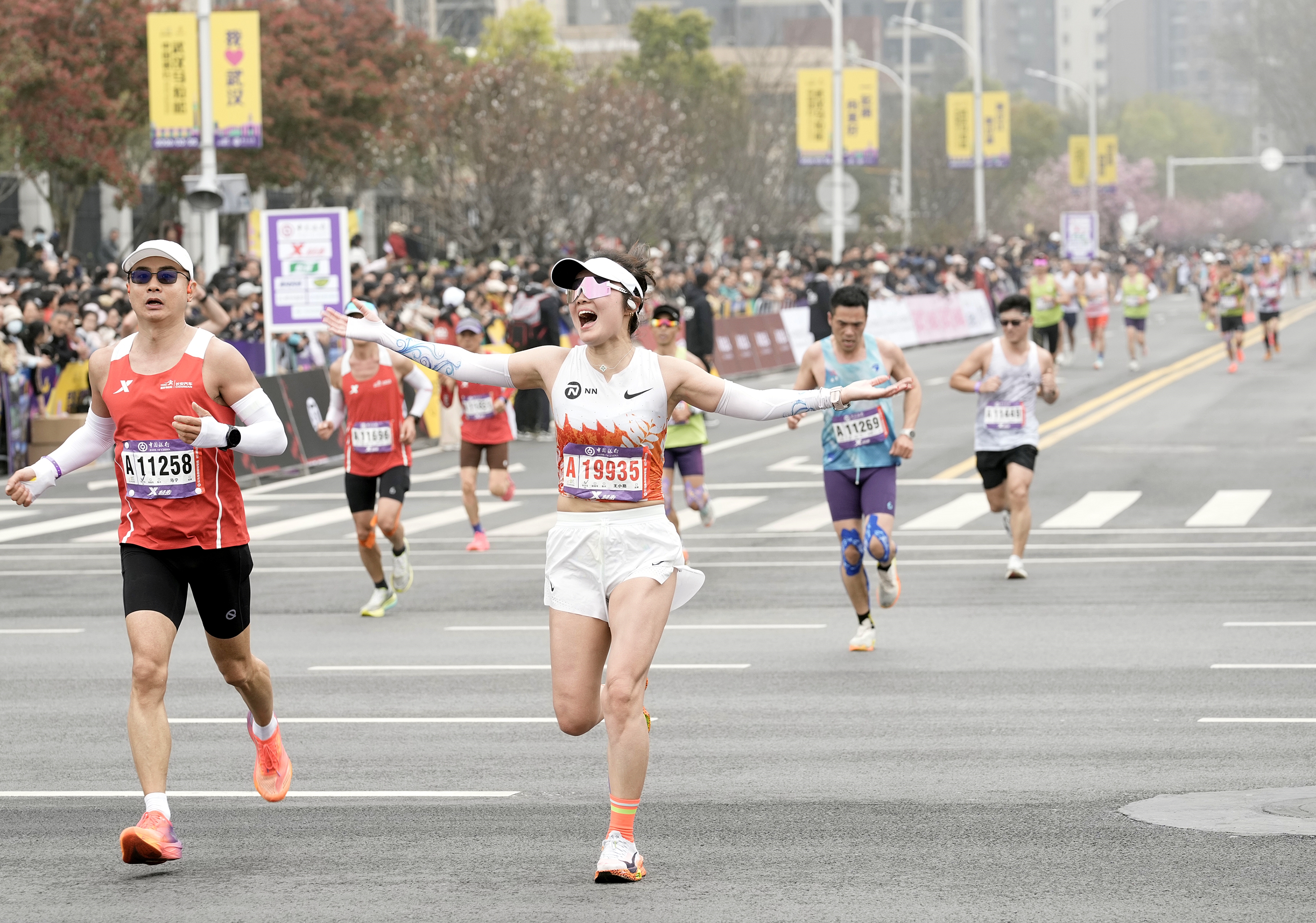 比赛期间,还正逢武汉全城百花盛开,樱花、海棠沿赛道次第绽放,粉白花瓣随江风轻舞。樱花造型的降温海绵、沉浸式樱花打卡场景,让每一位跑者都能在奔跑中邂逅春日惊喜。跑入青山江滩终点,在这条“最美冲刺赛道”的两侧,60余株新植的樱花树亭亭玉立,地面上78组樱花彩绘,让奔跑仿佛穿行于流动的花海。