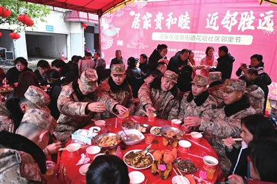 由咸安区温泉街道花坛社区新时代文明实践站、军分区小区联合主办的“居家贵和睦 近邻胜远亲” 第一届“邻里节”活动隆重举行。270名居民欢聚一起,品佳肴、话家常,剪窗花、写春联,以邻里友谊为桥梁,以“宴席”为载体,用最具烟火气的方式表达着最温暖的情谊,大力弘扬邻里友爱,诚信、团结亲善、守望相助的传统美德,融洽邻里亲情。