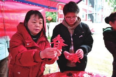 窗花剪纸区,来自该社区的“剪纸达人”钱幼红,为居民们准备好了剪纸用具,现场讲述了剪纸和窗花的相关知识与创作技巧。居民们在钱幼红的演示下体验剪纸文化。在学习中,一张张普普通通的红纸变成一幅幅“龙年”精美剪画,内有各种图案的窗花、龙、“福”字、“春”字。钱幼红说:“充满‘年味’的剪纸很受居民们的喜欢,100余幅剪纸很快就被居民们选中,陆续带回了家。”