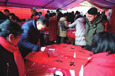 书法展示区,书法志愿者挽袖执笔,挥毫泼墨,一副副春联为居民送去新春祝福。“龙年吉祥如意到,岁岁平安福寿添”“新春如意多富贵,佳节平安添吉祥”……现场,一位居民高兴地说:“还是毛笔手写的春联有温度、有年味。”