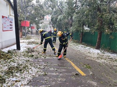 扫雪除冰过程中,低温天气丝毫没有击退大家的激情,手中的扫雪工具不断挥舞,忙碌的“火焰蓝”构成了一道亮丽风景线。