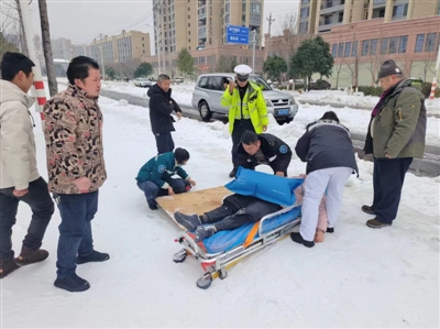 2月24日,咸安交警大队马桥中队执勤交警返回中队的路上,偶遇一名行人摔倒,躺在雪地上无法动弹,执勤交警立马停车查看。看到行人受伤后,立即联系120并通知家属,直到救护车将受伤的行人带走,执勤交警才返回岗位。
