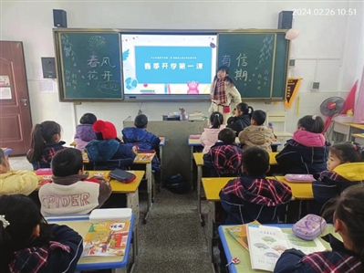为做好学生的“收心”工作,开学当日,该校各班还以“龙行龘龘启新程 前程朤朤谱新篇”为主题,开展了形式多样、丰富精彩的“开学第一课”,如,有的班级进行了寒假特色作业的展评活动;有的班级从“心”出发”关注学生的心理健康;有的班级“以梦为马 不负韶华”;有的班级开展了“安全教育最先行”主题班会……在老师的帮助下,孩子们再次踏上新征程,踏响青春豪迈的步伐,一起走进繁花似锦、美好无限的春天。 (通讯员余婷)