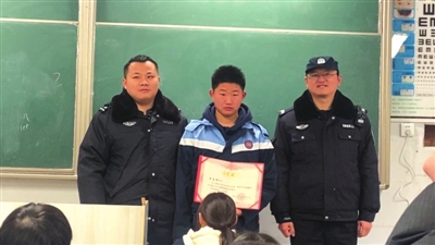 本报讯(记者 李思源 通讯员 杨晗 卢光明)3月4日,通城县城关初中七(10)班学生葛志明收到一份来自“警察叔叔”特殊的礼物——荣誉证书和学习用品,以表彰他见义勇为的行为。