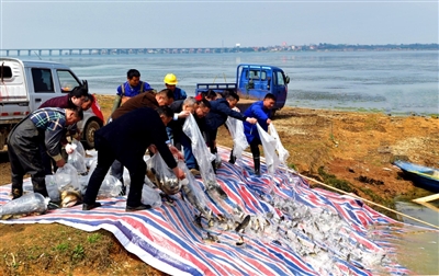 3月19日,市、区两级农业农村局在斧头湖碧桂园简易码头开展2024年度渔业人工增殖放流活动。向斧头湖投放白鲢、鳙鱼(花鲢)大规格鱼种(10cm以上)共计50万尾, 活动旨在加快实现咸安区“以水养鱼、以鱼净水、以鱼保水”的生态目标。(记者陈志茹 特约记者胡剑芳 李婷婷)