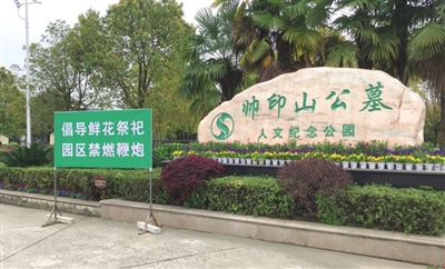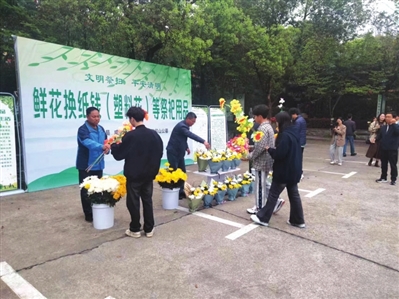 走进帅印山公墓,四处可见文明祭扫的横幅和标语,广播也在不断播放,倡导市民采用鲜花、果品等无烟祭扫的方式缅怀先人。公墓内还设置了鲜花祭拜区域,开展香烛、纸钱兑换鲜花活动,倡导绿色文明新风。
