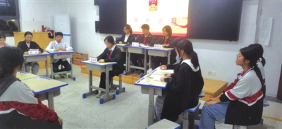 本报讯(记者 李思源 通讯员 卢邹勇)日前,通城一中高二18班和23班各自利用两节晚自习时间举行了“三案四场”模拟法庭活动。