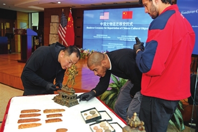 新华社电 国家文物局17日在中国驻纽约总领事馆接收美国纽约曼哈顿区检察官办公室向中国返还的38件文物艺术品。
