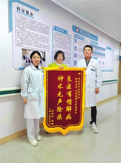 在和家属进行详细的术前沟通和经过完善细致的术前准备后,3月26日,在助手医师王剑的密切配合下,郭建为椎管内麻醉下的张女士进行了手术,手术全程仅一个小时,非常顺利成功,术后,在该院外科护理团队的精心看护下,张女士右肾积水明显好转,康复出院。在家休养近一个月后,心怀感恩的张女士为郭建主任、王剑医师及其护理团队送来了锦旗,于是就出现了本文开头的那一幕。