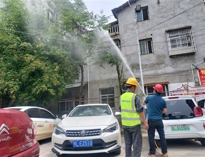 ???? 近日,咸安西大街社区蔬菜公司小区内6棵栾树出现了病虫害现象。4月24日,市园林绿化公司组织5名园林工人手持喷雾枪对小区栾树进行了喷药除虫、全面清理。(记者 葛利利 )