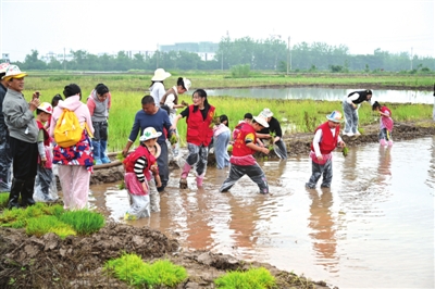 “小朋友学过插秧吗?”“大家知道现在种下的是早稻还是中稻?”……来到田埂,水稻专家为小记者们讲解水稻的相关知识,以及插秧的技巧和注意事项。随后小记者们在家长的帮助下穿戴好插秧水靴,小心翼翼地走入水田,与泥土亲密接触,体验插秧育苗的快乐。“小心,4支苗为一株,两株间隔10公分左右。”农民伯伯一边指导,一边提醒。小记者们“身陷”泥田,惧怕摔倒,但又乐在其中的插秧。“平时踩的都是硬地,在稻田里踩下去软乎乎的。”经过刚开始的不适应,小记者们很快就与稻田“融为一体”。看着自己插下去的秧苗歪歪倒倒,即使被泥水淹没,大家也一本正经扶正。此时人群中家长说:“我们吃的大米就是农民伯伯这样面朝黄土背朝天,一株一株种下来的。我们是不是应该珍惜粮食?”