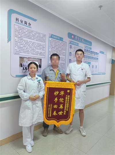 5月14日,79岁阮婆婆家属就专程为万楼主任及其医护团队送来了一面绣着“华佗再世 妙手回春”八个金光闪闪大字的锦旗,以此表达对万楼主任及其医护团队的感激之情,而这,已经是万楼主任今年所收到的第5面锦旗。