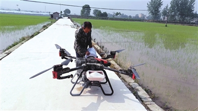 近日,位于崇阳县青山镇吴城村的隽青家庭农场,“90后”农机手孙进正坐在田埂上用手机操控着无人机,为稻田追肥。只见他手指轻轻一点,无人机瞬间起飞,跃上半空作业,一来一回仅需1分钟。