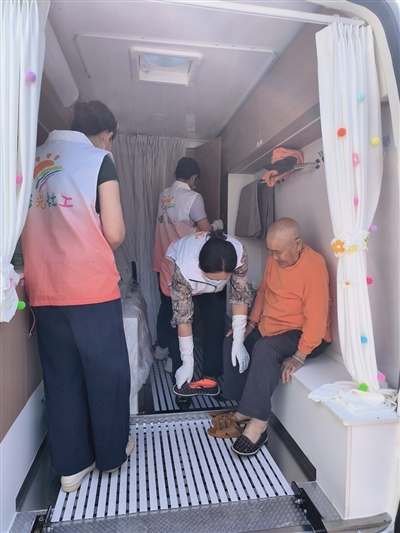 本报讯(记者黄柱 通讯员魏颖 吴嵘)5月17日,一辆流动助浴车驶入赤壁市蒲圻街道陆水社区车站路1号。91岁的居民刘三元接到社区通知后,一早就过来等候。在进行信息登记、测量血压、理发、修面等程序后,在助浴师的帮助下,她进入车内接受助浴服务。