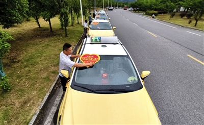 昨日下午,咸宁城区市游客集散中心附近,城顺出租汽车有限公司正组织参加高考爱心护考的出租车司机系上黄丝带,张贴“爱心送考车”标识。