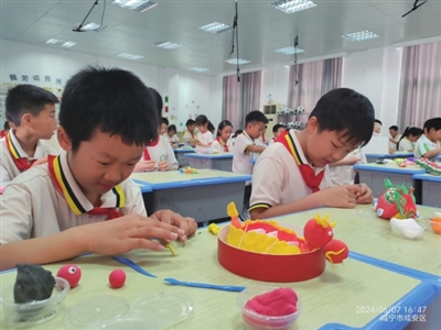 在学端午现场,老师们精心准备PPT,组织学生学习了解端午节的来历和相关历史故事。在对端午节的了解之后,孩子们跃跃欲试要开始用自己的方式“过端午”。一二年级的学生编织彩绳手链,三四年级学生做创意龙舟,彩泥捏龙舟、画龙舟,五六年级的学生巧手填“鸭”,在咸鸭蛋上作画。三(5)班宋沐阳,精雕细琢捏了一艘龙舟,红色喜庆的船身,绿色点缀龙须,龙舟上几个憨态可掬的龙舟手正在奋力划桨,栩栩如生。