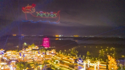 6月10日,恋江湖·嘉鱼不夜城上空,400台无人机演绎变换出端午安康、龙舟、屈原、嘉鱼欢迎您等数种图形,为游客带来一场视觉盛宴,令人叹为观止。