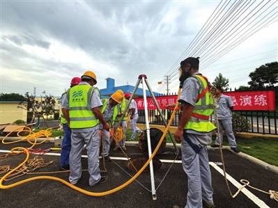 本次演练模拟管网部作业人员下井进行关闭阀门作业时,突然感到头晕、乏力,并伴随呼吸困难,随后晕厥。同行人员发现作业人员突然昏迷后,无任何防护措施,贸然下井救援,也昏迷倒地,现场监护人员在发现异常情况后,立即向上级主管报告事故情况,公司立即启动应急预案,拨打119、120急救并同时进行施救。应急救援组先对事故区域进行警戒,并进行了井下通风和有害气体检测,支好三脚架。同时另一名救援人员穿戴安全带和长管呼吸器等安全防护用品后进入井下进行救援,下井后将作业人员绑好安全绳,佩戴好呼吸面罩后,提升出井外,并抬放至空气流通处。应急救护组对昏迷人员立即采取心脏复苏等现场急救措施,后送往医院治疗,经过十几分钟紧张有序救援,事故紧急状态解除。