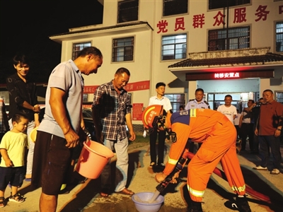疏散现场,忙而有序。转移安置组成员、信息员指引帮扶村民按预案规划的路线安全转移至避险安置区;医护人员迅速伴随转移村民至安全区点,查看询问需要医护的人员并实施医护护理;后勤保障责任人及时向安置区村民提供发放生活物资矿泉水等。