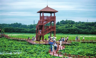 荷叶层层叠叠,荷花迎风舞动,蜿蜒的栈道深入荷塘中心,高高的观景台可以俯瞰荷塘全景,游船和乌篷船充满古风韵味。