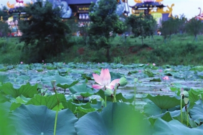 穿过各类场馆,走过花海迷宫,就能发现田园风满满的稻田和荷花田。粉白荷花美如画卷,田田荷叶铺满池塘,凉风习习,荷香醉人。
