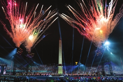 本届残奥会开幕式主会场设置在巴黎市中心的协和广场,主舞台围绕着广场中央的方尖碑而建。来自各个国家和地区的代表团成员从凯旋门方向,沿香榭丽舍大街走进主会场并围绕主舞台就座。