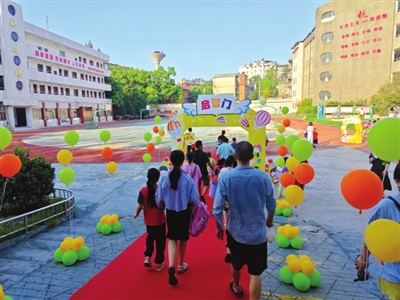为了欢迎新同学,当日上午7时许,该校全体行政人员便在校门两侧等候,给孩子们送去最亲切的问候。每一个入校的孩子都敲响磅礴的鼓声,踏上鲜红的地毯,像一条条灵巧的小鲤鱼,跨过一道道祝福的门槛,奔向了启迪智慧的“龙门”。