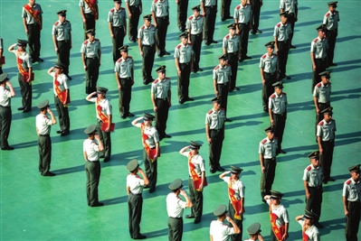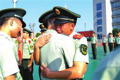 8月31日,武警湖北总队咸宁支队某部举行2024年秋季退役士兵退役仪式,留队官兵与退役官兵互相敬礼告别并合影留念。