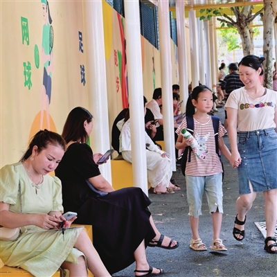 最让人感到贴心的是,人行道上清晰地按班级划分了家长等候区,不仅有座位供家长、学生休憩,还建设了能遮风挡雨的风雨连廊。整条道路墙面进行了美化,将“谦虚礼貌”“励志勤学”等中国传统美德、文明宣传通过生动可爱的图画展示在墙面,上下学路上,文明之风扑面而来。