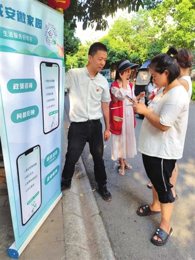 在福临天下小区,党员干部细心向居民介绍道:“大姐,您点击报事这里,您的诉求就可以直达社区,社区会把你们密切关注的人社、医保、招聘等信息,推送到程序,方便相关单位及时查收处理”。