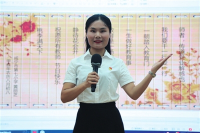 “教师轻轻地拥抱,是无声的鼓励,胜过千言万语。在老师的怀抱里,学生感受到了无尽的关怀与包容,如春风拂面,温暖心田……”大会现场,优秀教师代表咸宁市第三实验小学钱幼红、咸宁市第二实验小学杜莹、咸宁市第七小学黄丽芝和咸宁市香城学校王晓红分别以《用爱心弹拨学生的心弦》《潜心教学勇带头 不需扬鞭自向前》《三尺讲台 一生耕耘》《以爱育爱 一路生芳》为主题,围绕自身从教经历、教学经验和学习策略进行了经验分享。