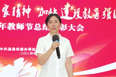 “过去的一年,在教育局党委及温泉办事处党工委的坚强领导下,在全处教育人的共同努力下,全面贯彻落实中央、省、市、区教育工作会议精神,落实立德树人根本任务,全力推进温泉教育向高质量发展,取得了可喜的成绩。”温泉教育总支管理员卢建勋在致辞中代表教育总支,向辛勤工作在教育战线上的全体教育工作者,离退休教师致以节日的问候和崇高的敬意,对长期关心教育的社会各界人士,表示最衷心的感谢,对大会上受到表彰的各类教育先进个人,表示热烈的祝贺。他从“党建工作”“教师队伍建设”“双减落实情况”“教学质量提升”“校园安全管理”“发展保障”“综合教育”“教联体工作”六个方面,回顾了温泉教育片区内,各校所作出的亮点工作和成绩,要求全体教师要坚持回答好“培养什么人”这个教育的首要问题,做到吾日三省吾身,将“培养什么人,为谁培养人,怎样培养人”想清楚干出彩;坚持落实好“立德树人”教育的根本任务;坚持弘扬好教育家精神,创新教育思想、教育模式、教育方法,致力形成自己的教学特色、办学风格。