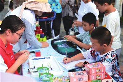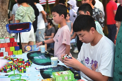 现场,青年学子三五成群,年轻的父母带着孩子,银发老人在儿孙的陪伴下一起来赶集,领取“游园卡”,体验“中秋知多少”“你比我猜”“花灯邀月”“蹴鞠”“指尖生花”等游戏,集章兑换心仪的精美奖品。大家乘兴而来,满载而归,全场充满了欢声笑语。
