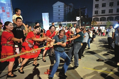 趣味运动会上,拔河、跳绳、投篮、吃瓜比赛等轮番上阵,居民们踊跃参与。加油声、呐喊声此起彼伏,欢乐满满。