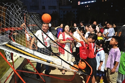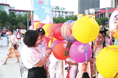品茗赏月、猜谜、漆扇、投壶、飞花令……传统游戏、非遗手工、迎风飘动色彩斑斓的中秋灯笼,还有嫦娥玉兔主题画,游园会里妙趣横生,美不胜收。不少居民和孩子们穿着汉服,挨个在各个摊位上拍照、打卡。抱着玩游戏、做手工奖励来的小礼品,大家相互交流游戏心得、手工技艺,笑逐颜开。