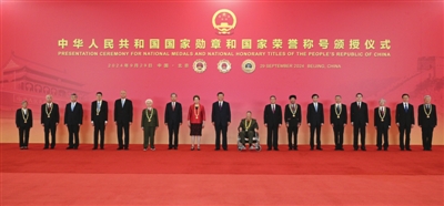 行。习近平等领导同志同国家勋章和国家荣誉称号获得者合影留念。          新华社发 9月29日,中华人民共和国国家勋章和国家荣誉称号颁授仪式在北京人民大会堂金色大厅隆重举行。中共中央总书记、国家主席、中央军委主席习近平向国家勋章和国家荣誉称号获得者颁授勋章奖章并发表重要讲话。 新华社发